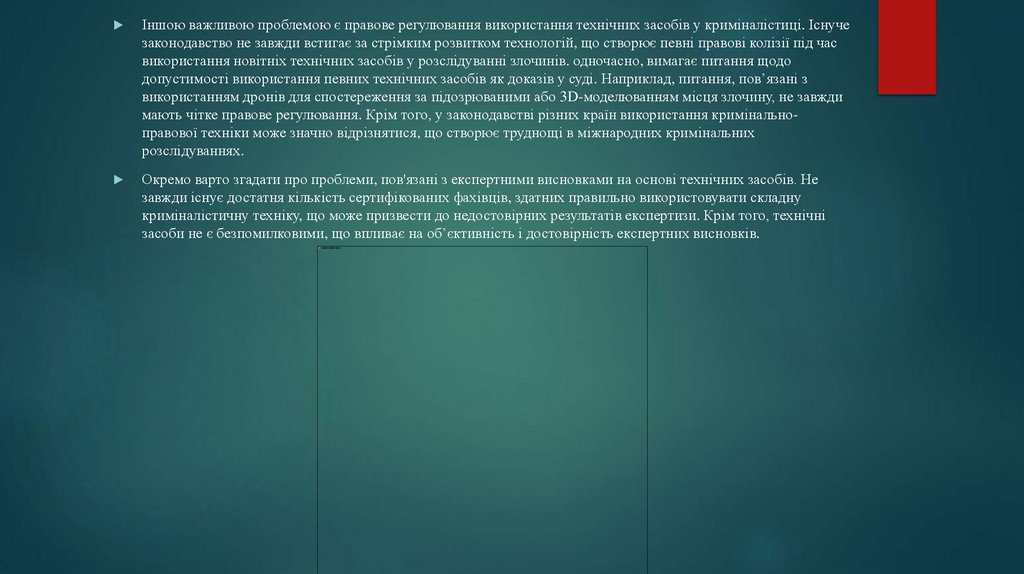 Іншою важливою проблемою є правове регулювання використання технічних засобів у криміналістиці. Існучезаконодавство не завжди встигає за стрімким розвитком технологій, що створює певні правові колізії під час