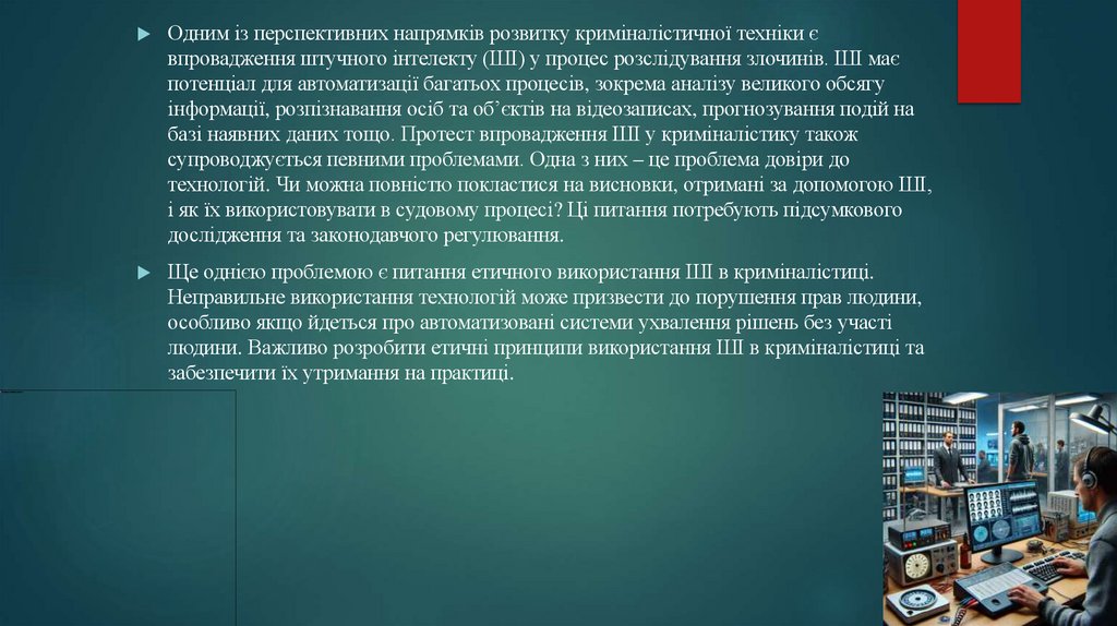 Ще однією проблемою є питання етичного використання ШІ в криміналістиці.