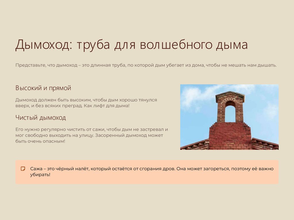 Дымоход: труба для волшебного дымаПредставьте, что дымоход – это длинная труба, по которой дым убегает из дома, чтобы не мешать нам дышать.
