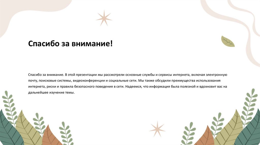 Спасибо за внимание!Спасибо за внимание. В этой презентации мы рассмотрели основные службы и сервисы интернета, включая электронную