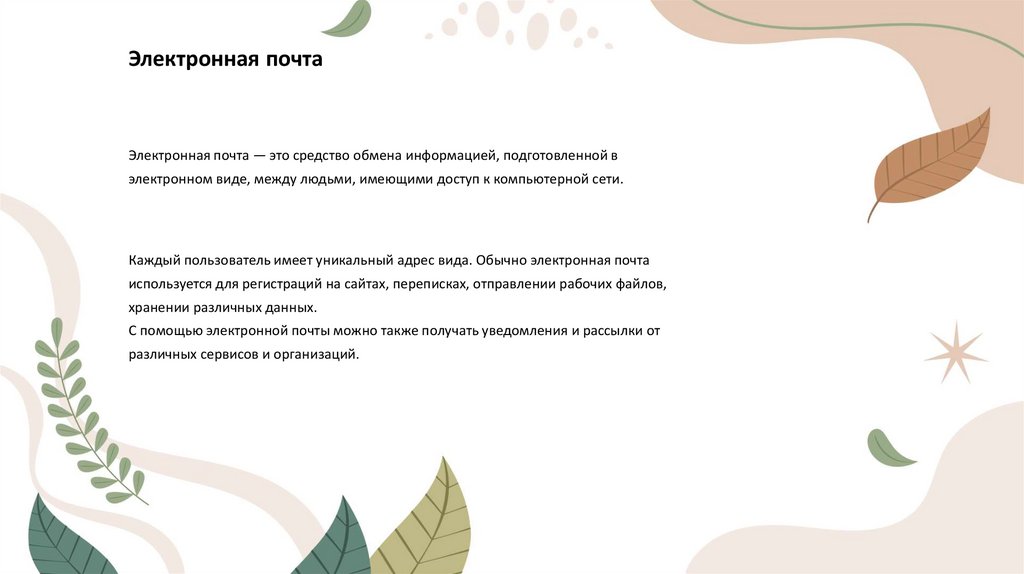 Электронная почтаЭлектронная почта — это средство обмена информацией, подготовленной в