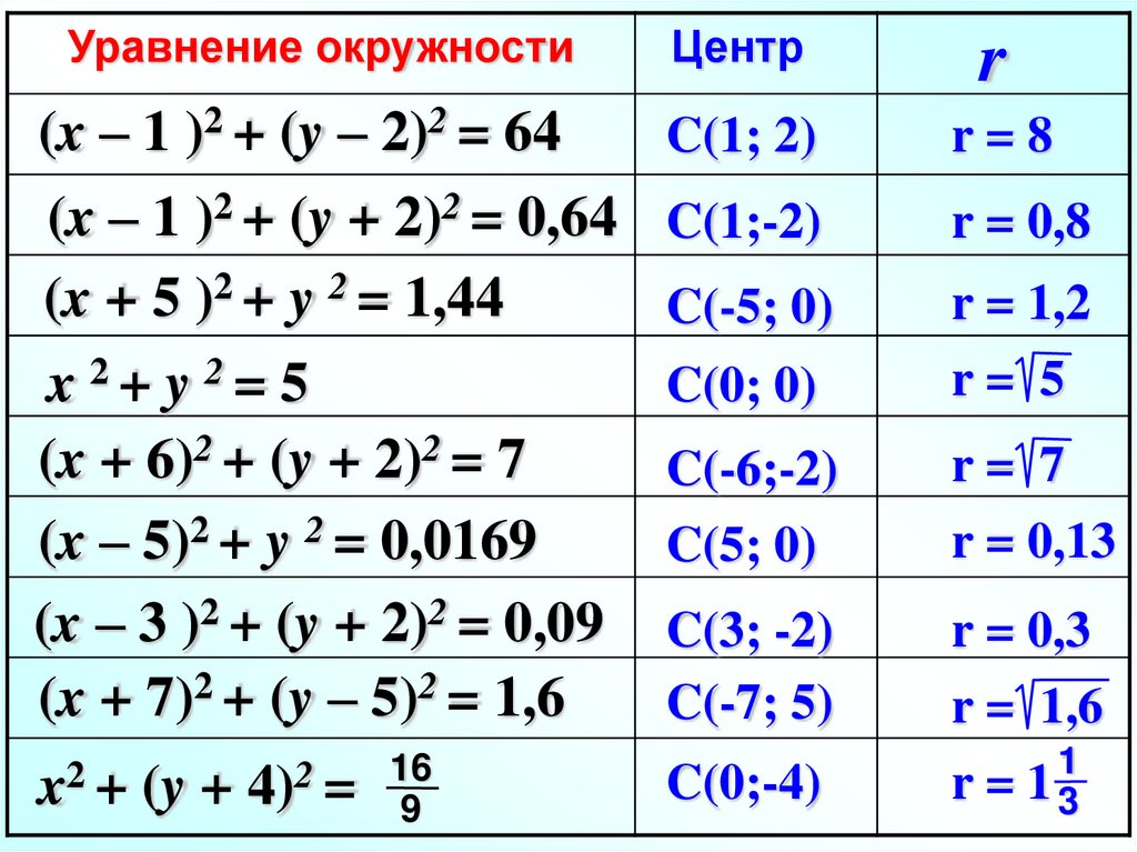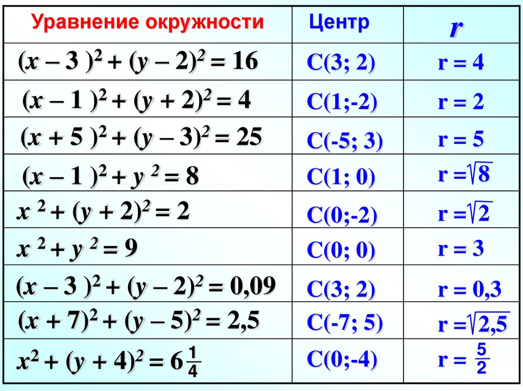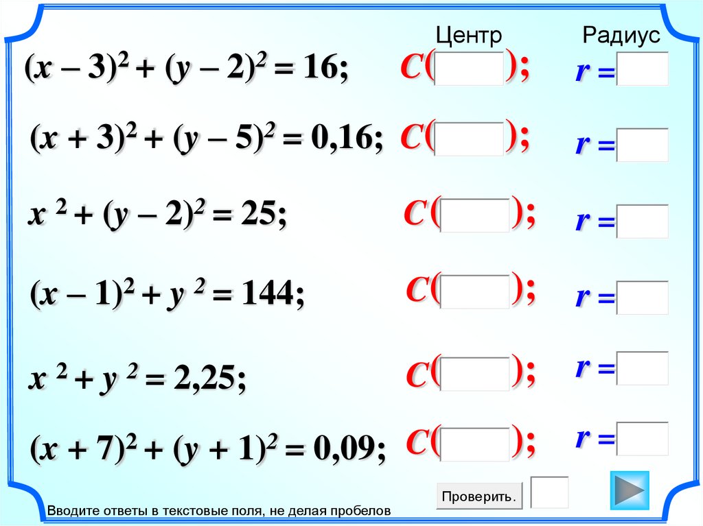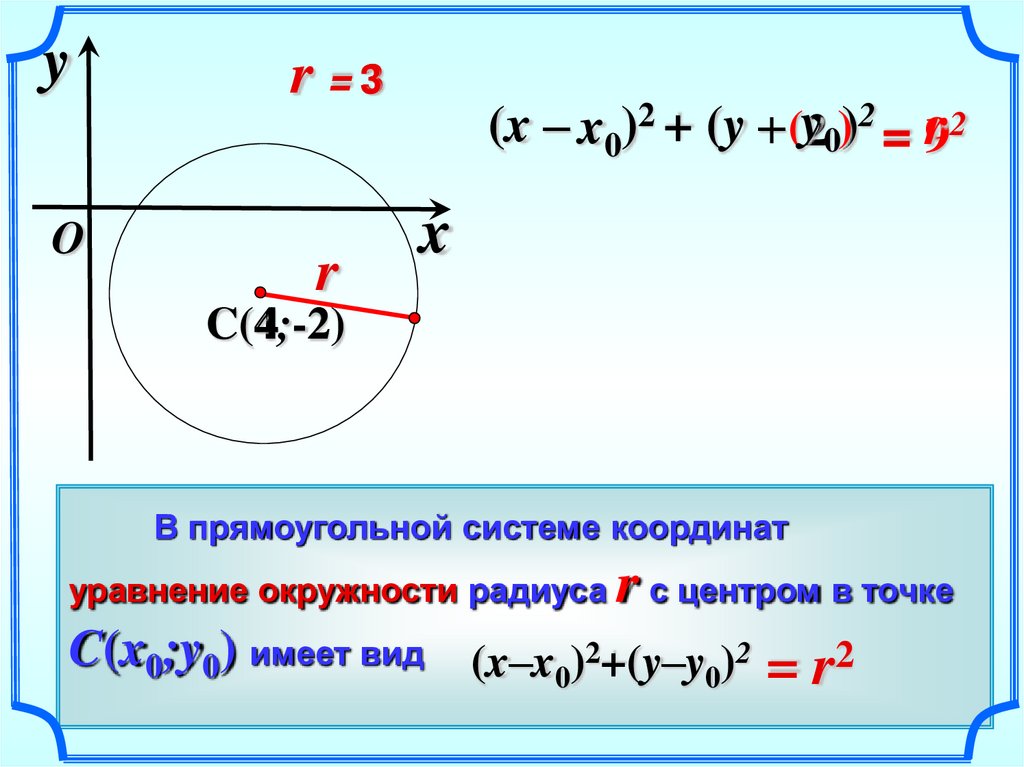 (x – 3)2 + (y – 2)2 = 16;Центр