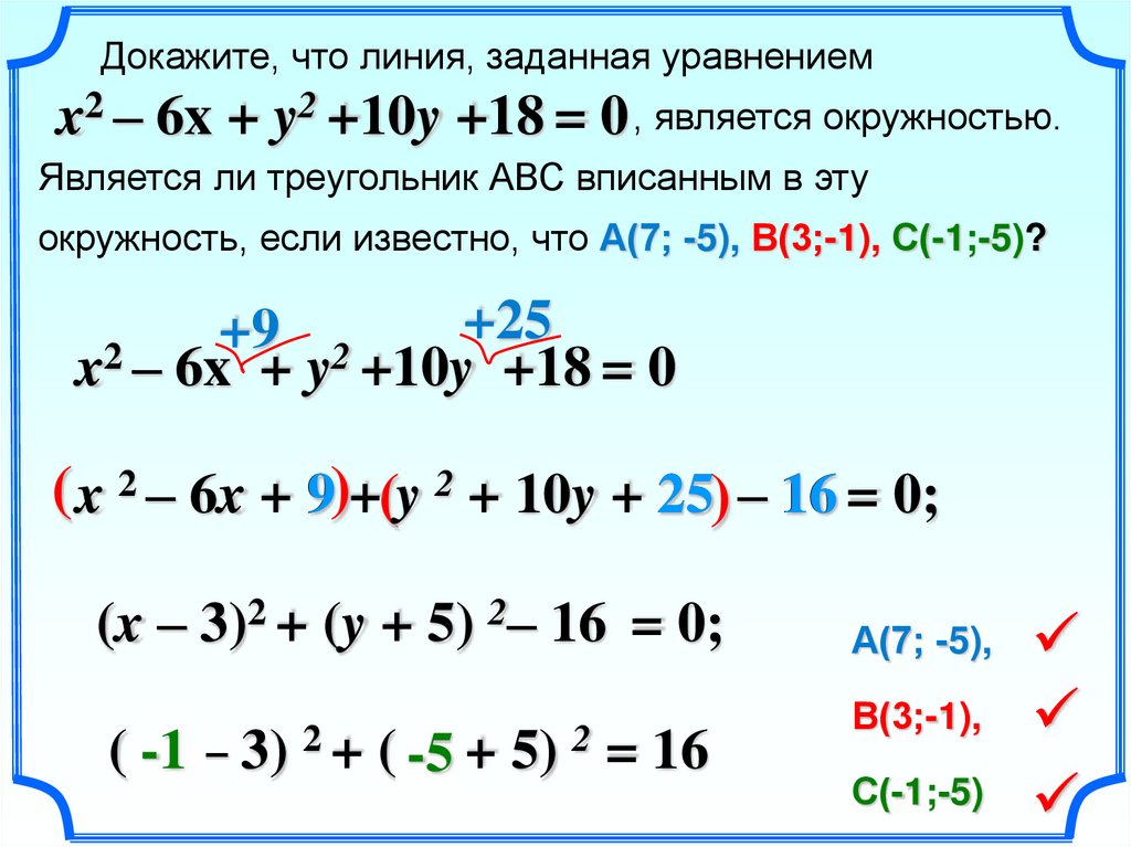 Докажите, что линия, заданная уравнениемx2 – 6x + y2 +10y +18 = 0 , является окружностью.