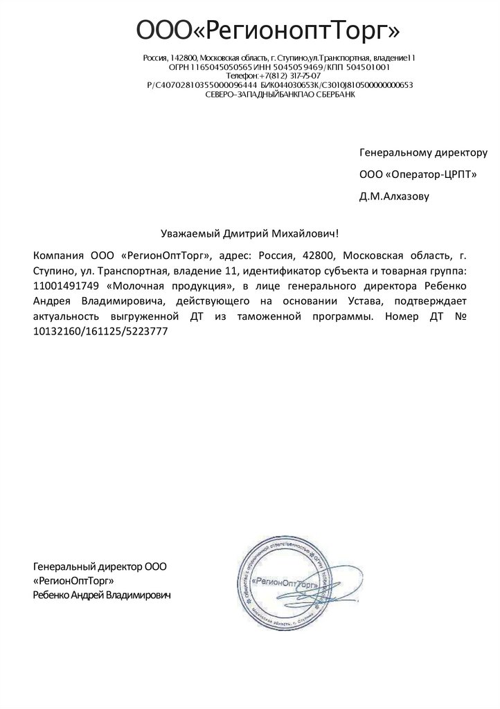 11001491749 «Молочная продукция», в лице генерального директора Ребенко
