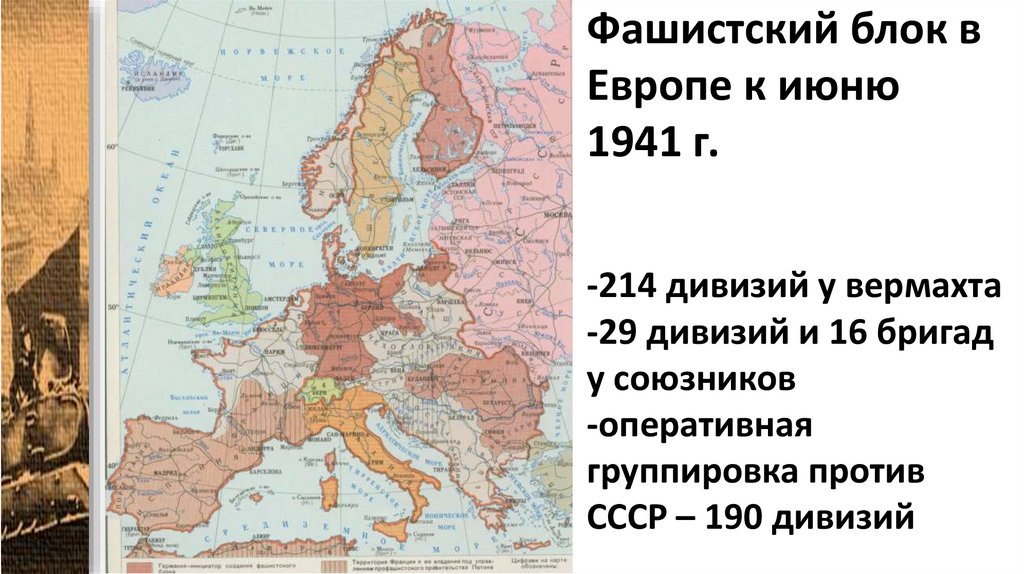 1. Фашистский блок в Европе к июню 1941 г. -214 дивизий у вермахта -29 дивизий и 16 бригад у союзников -оперативная группировка