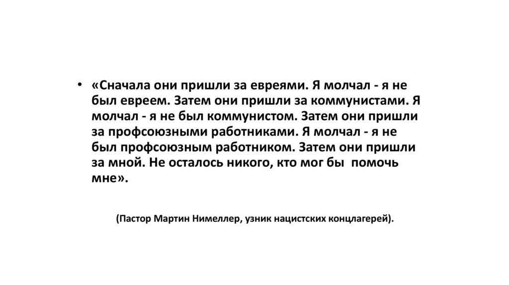 • «Сначала они пришли за евреями. Я молчал - я небыл евреем. Затем они пришли за коммунистами. Я