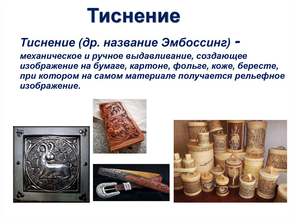 ТиснениеТиснение (др. название Эмбоссинг) механическое и ручное выдавливание, создающее
