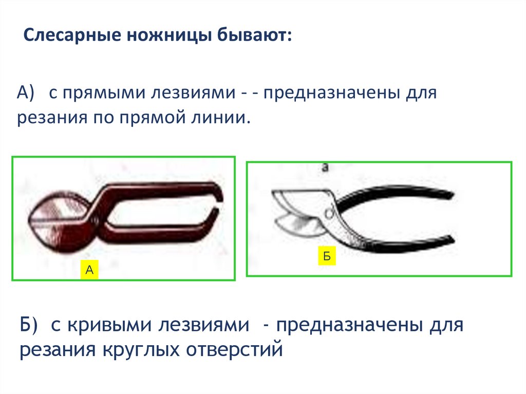Слесарные ножницы бывают:А) с прямыми лезвиями - - предназначены для