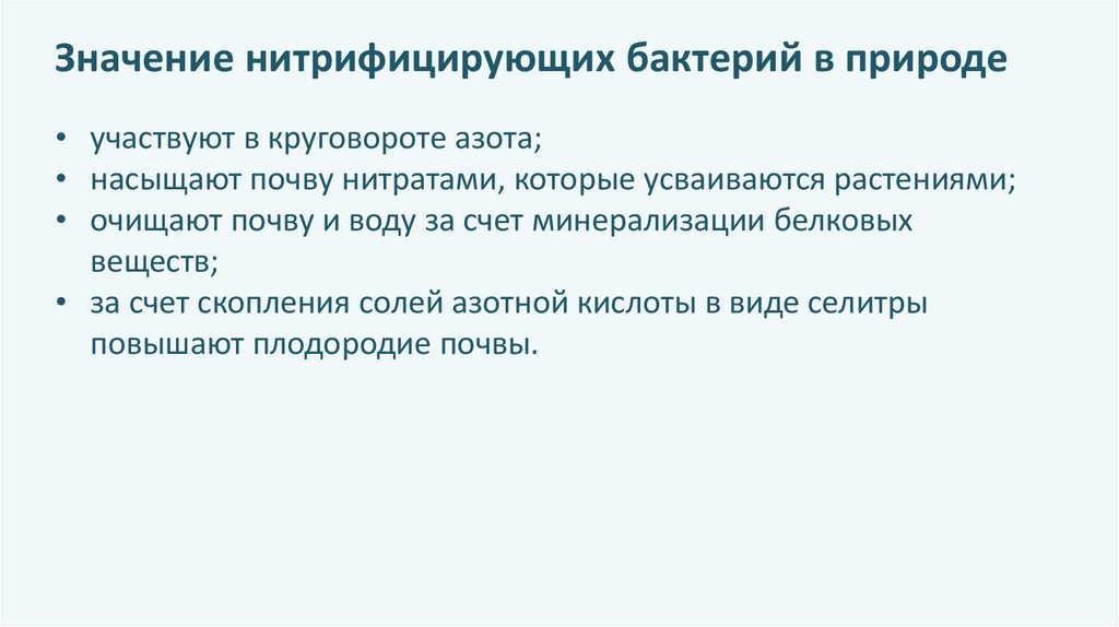Значение нитрифицирующих бактерий в природе• участвуют в круговороте азота;