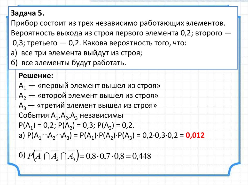 Задача 5.Прибор состоит из трех независимо работающих элементов.