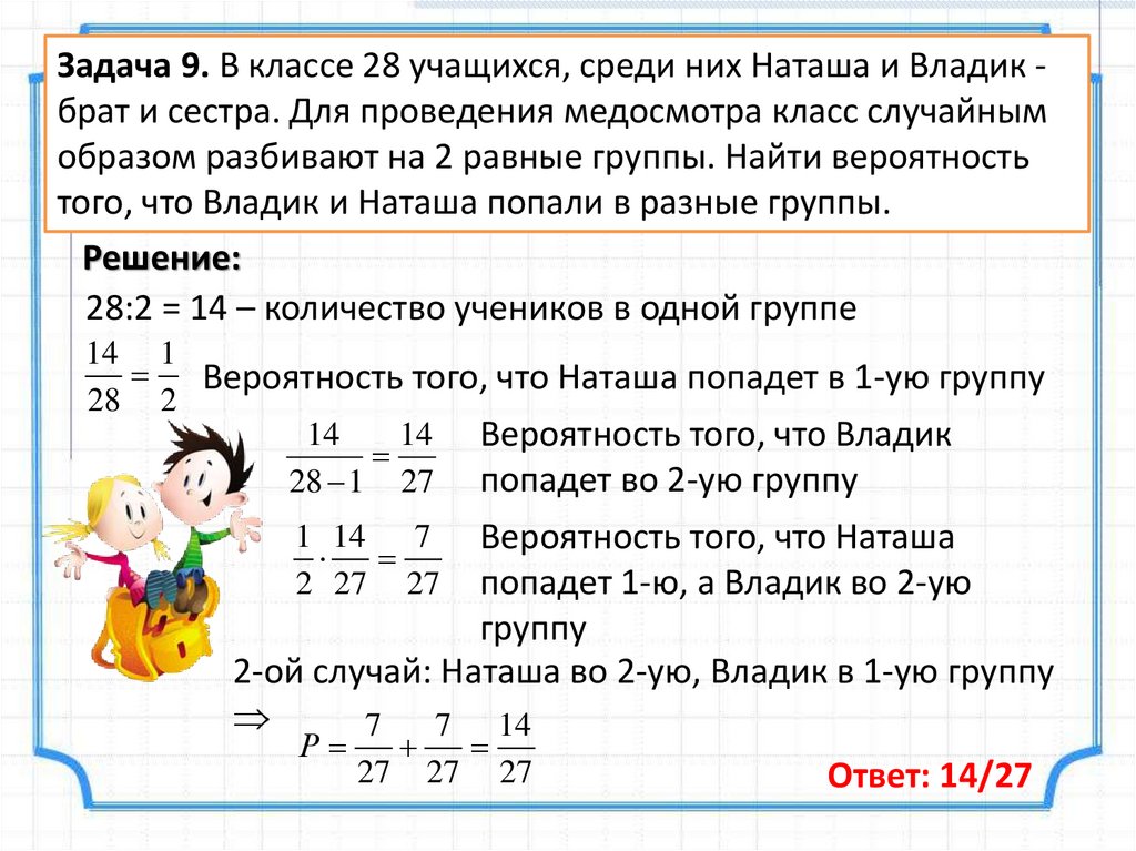 Задача 9. В классе 28 учащихся, среди них Наташа и Владик брат и сестра. Для проведения медосмотра класс случайнымобразом разбивают на 2 равные группы. Найти вероятность