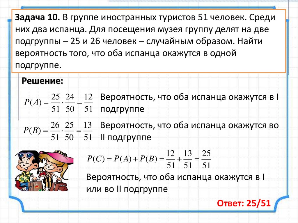 Задача 10. В группе иностранных туристов 51 человек. Срединих два испанца. Для посещения музея группу делят на две