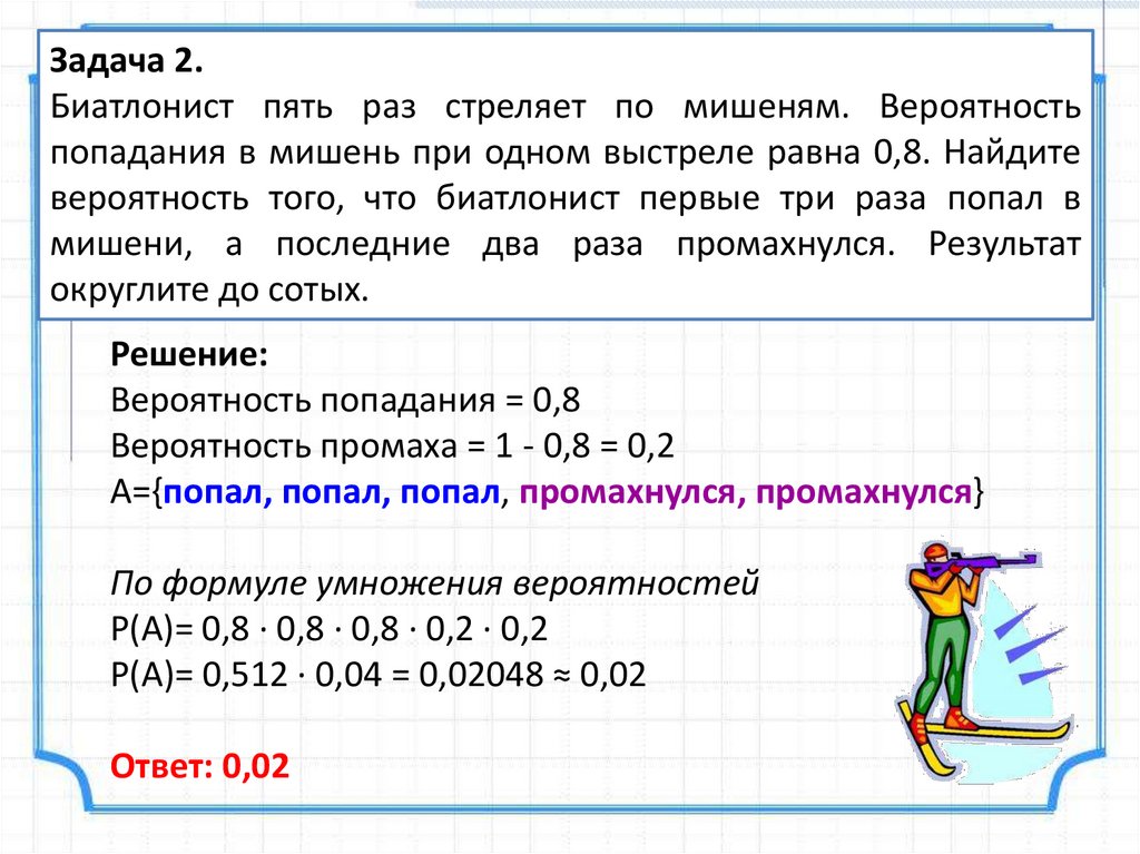 Задача 2.Биатлонист пять раз стреляет по мишеням. Вероятность
