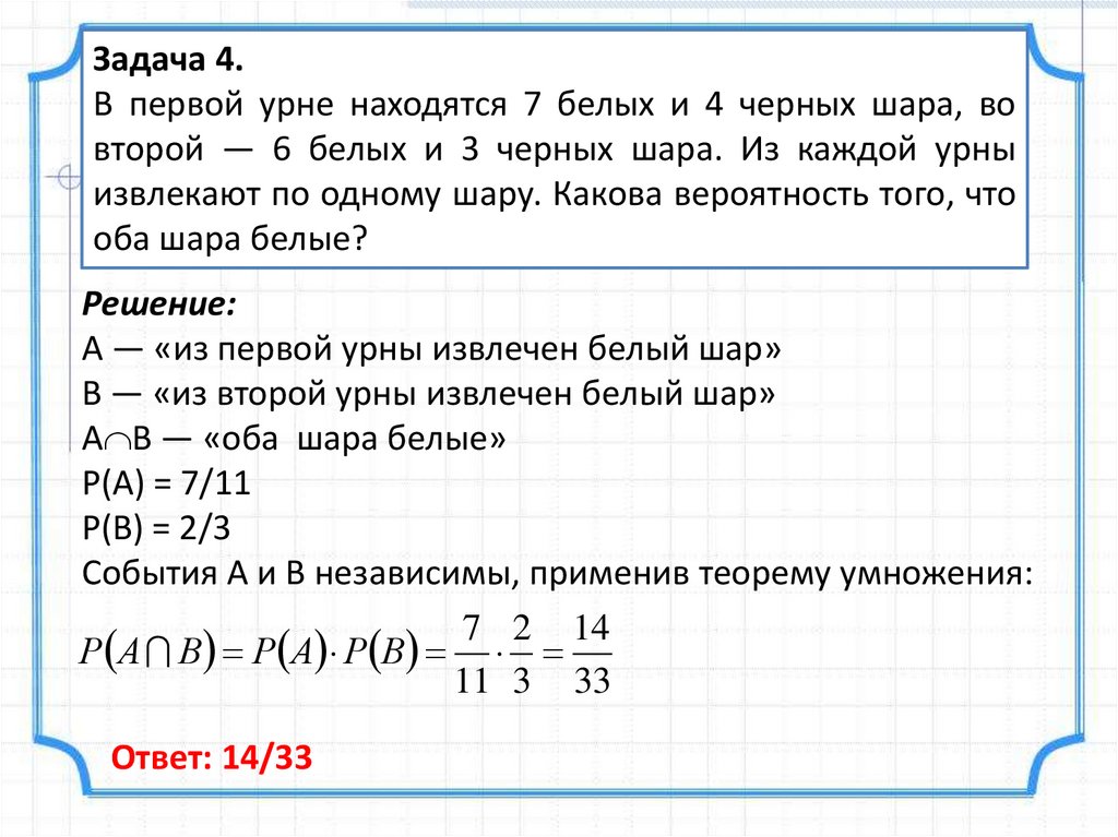 Задача 4.В первой урне находятся 7 белых и 4 черных шара, во