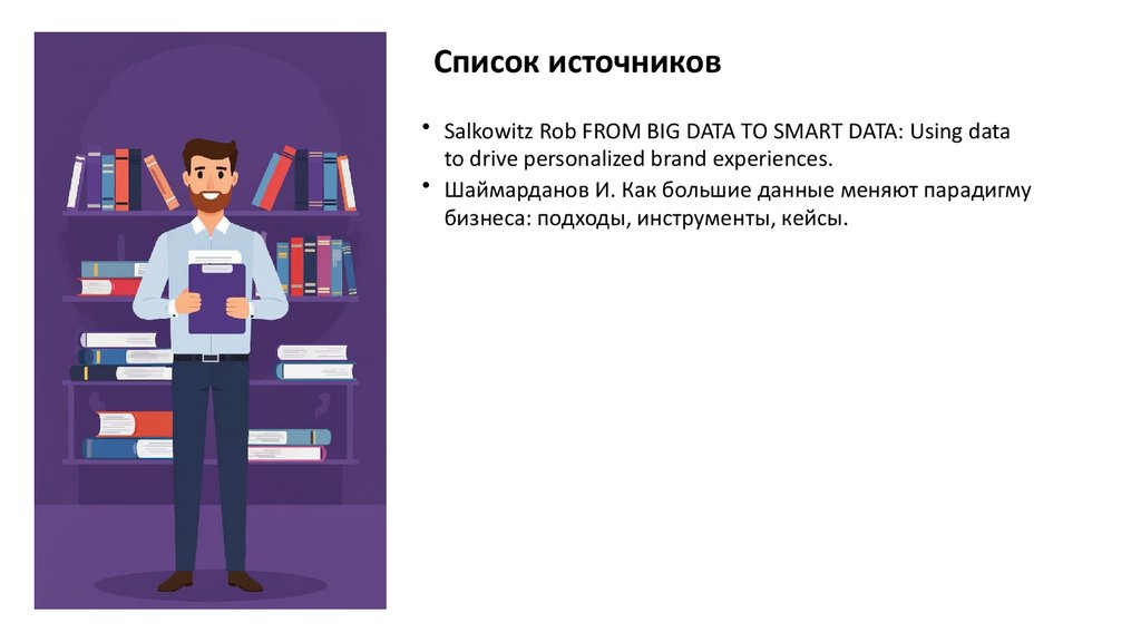 Список источников• Salkowitz Rob FROM BIG DATA TO SMART DATA: Using data