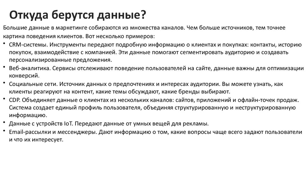 Откуда берутся данные?Большие данные в маркетинге собираются из множества каналов. Чем больше источников, тем точнее