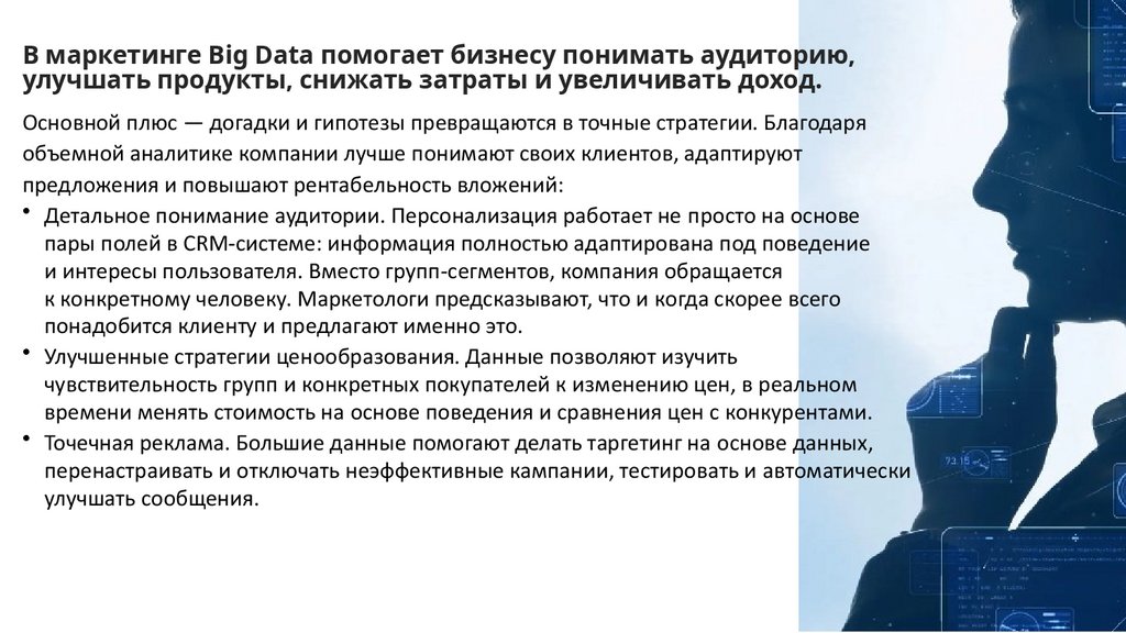 В маркетинге Big Data помогает бизнесу понимать аудиторию,улучшать продукты, снижать затраты и увеличивать доход.