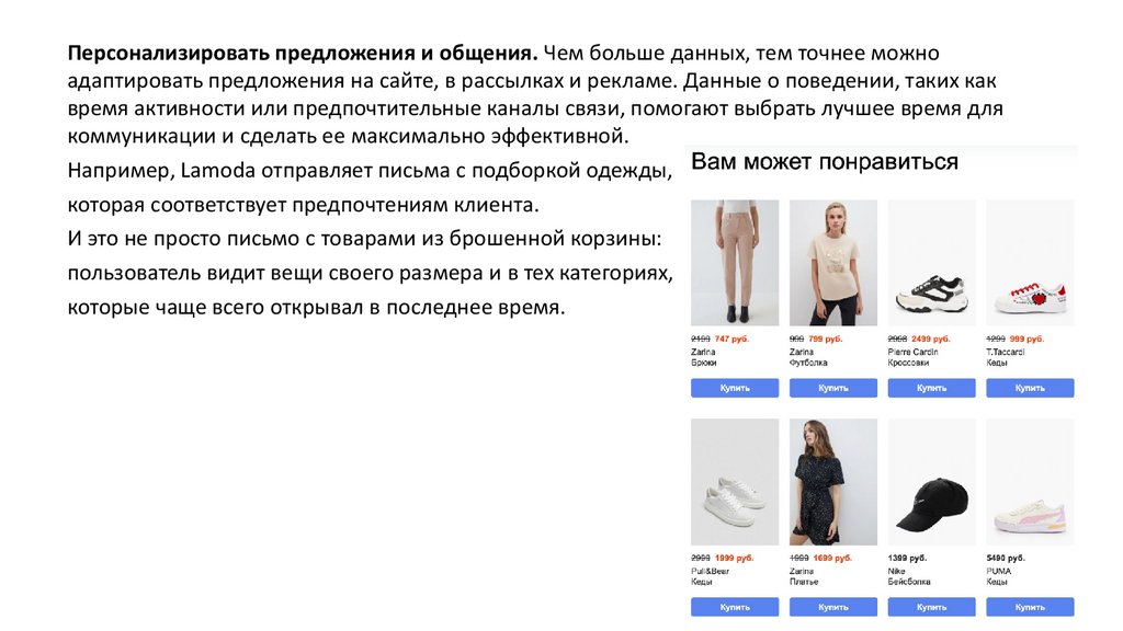 Персонализировать предложения и общения. Чем больше данных, тем точнее можноадаптировать предложения на сайте, в рассылках и рекламе. Данные о поведении, таких как