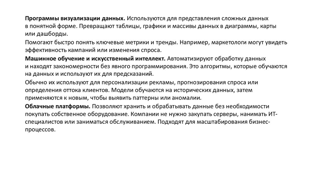 Программы визуализации данных. Используются для представления сложных данныхв понятной форме. Превращают таблицы, графики и массивы данных в диаграммы, карты
