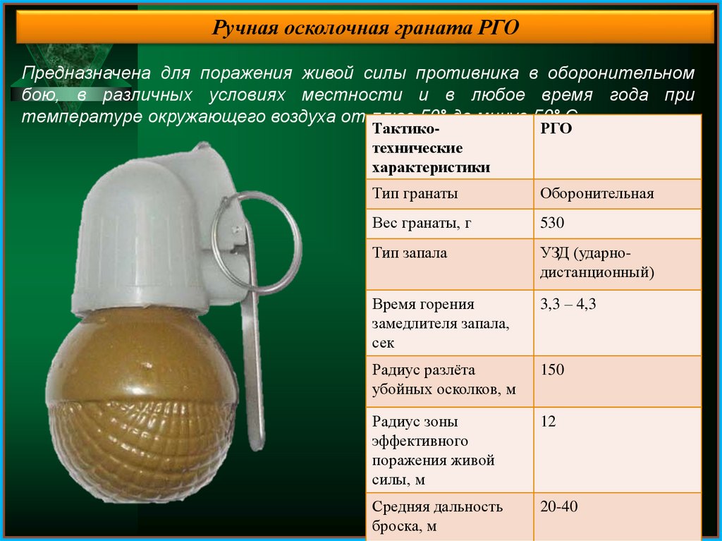 Ручная осколочная граната РГОПредназначена для поражения живой силы противника в оборонительном