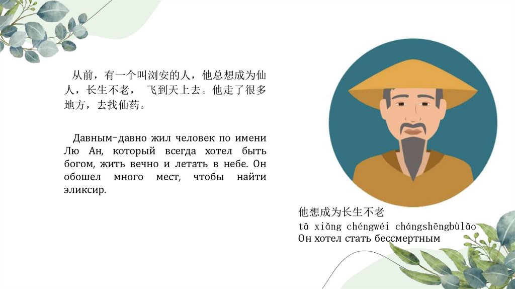从前 有一个叫浏安的人 他总想成为仙人 长生不老 飞到天上去。他走了很多