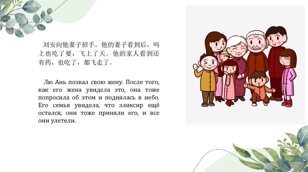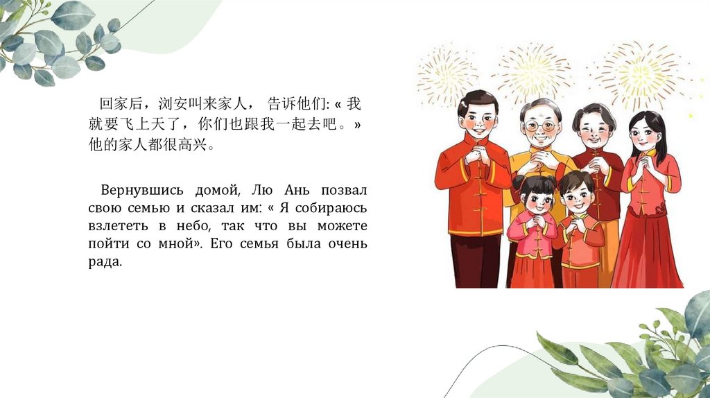 回家后 浏安叫来家人 告诉他们: « 我就要飞上天了 你们也跟我一起去吧。»