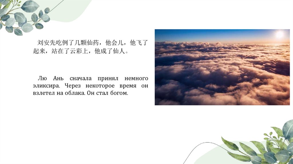 刘安先吃例了几颗仙药 他会儿 他飞了起来 站在了云彩上 他成了仙人。