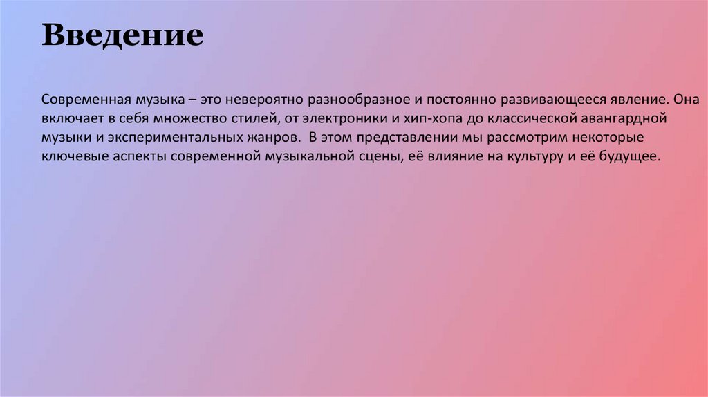 ВведениеСовременная музыка – это невероятно разнообразное и постоянно развивающееся явление. Она