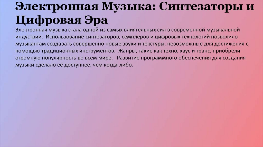 помощью традиционных инструментов. Жанры, такие как техно, хаус и транс, приобрели