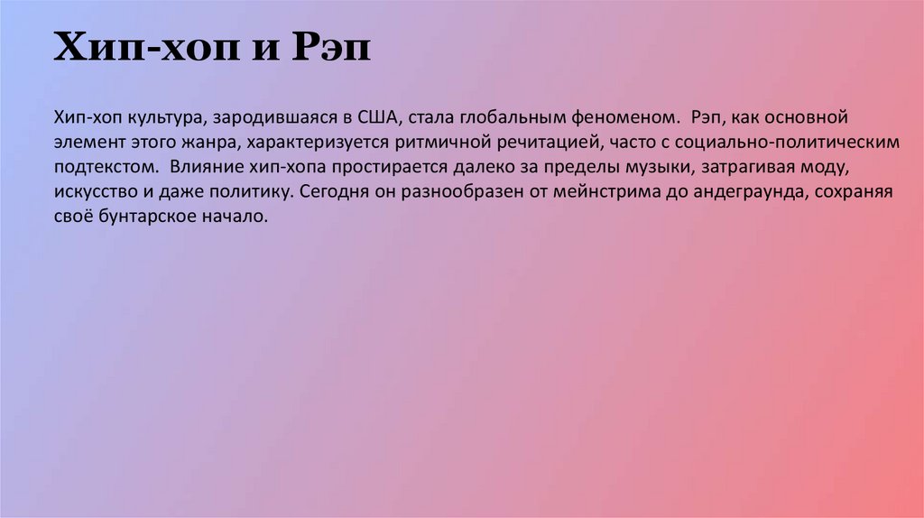 Хип-хоп и РэпХип-хоп культура, зародившаяся в США, стала глобальным феноменом. Рэп, как основной