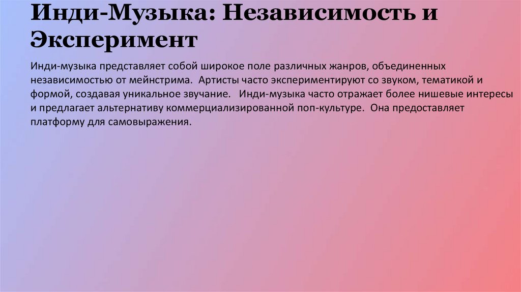 формой, создавая уникальное звучание. Инди-музыка часто отражает более нишевые интересы