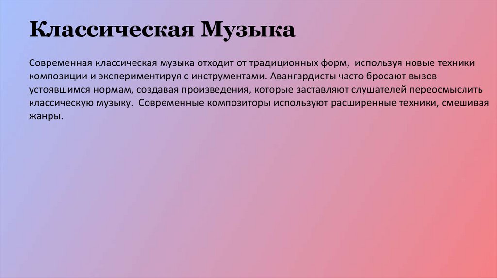 Классическая МузыкаСовременная классическая музыка отходит от традиционных форм, используя новые техники
