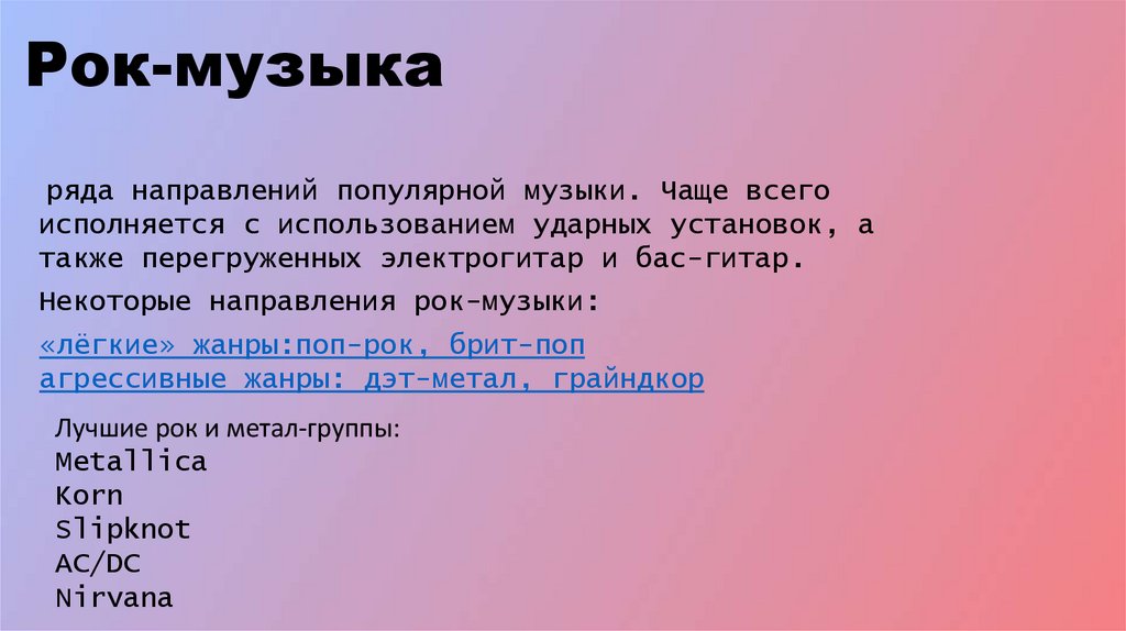 Рок-музыкаряда направлений популярной музыки. Чаще всего