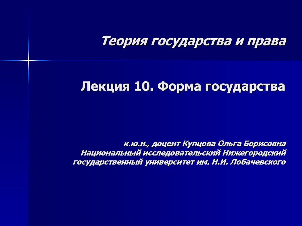 1. Теория государства и права Лекция 10. Форма государства к.ю.н., доцент Купцова Ольга Борисовна Национальный исследовательский