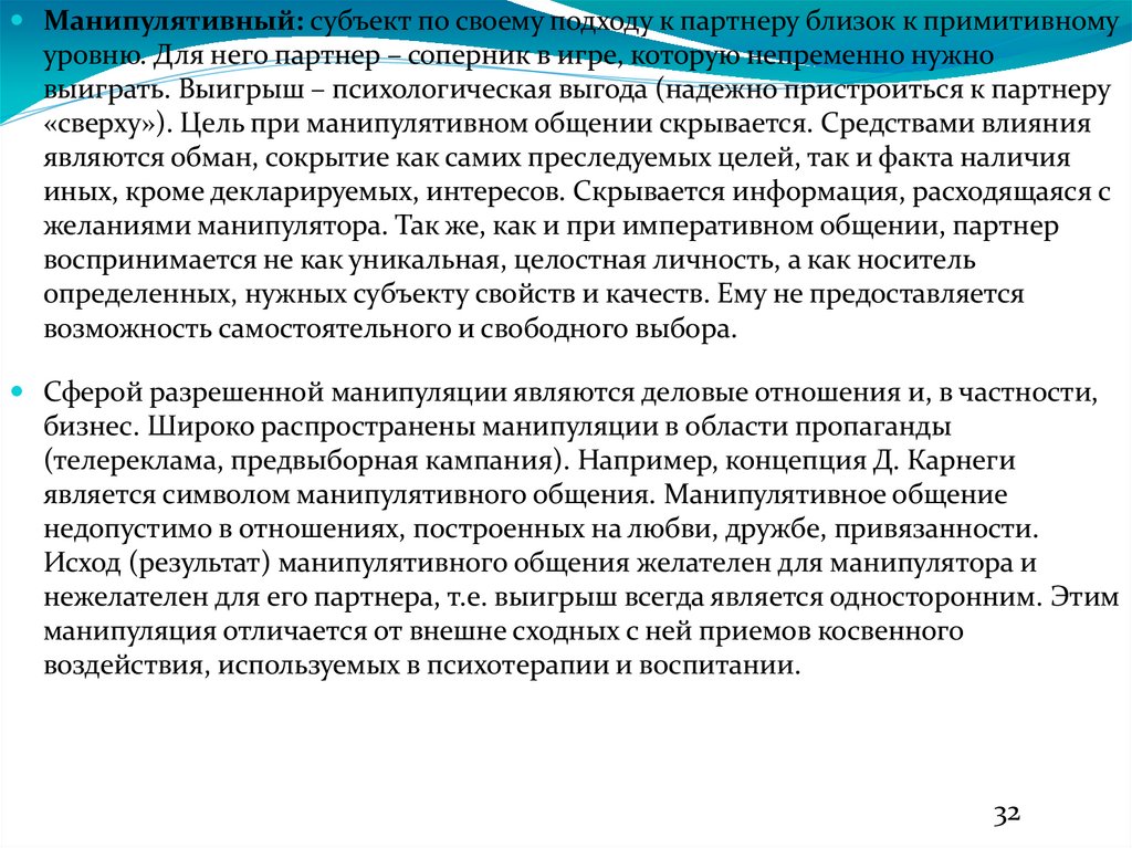 Манипулятивный: субъект по своему подходу к партнеру близок к примитивномууровню. Для него партнер – соперник в игре, которую непременно нужно