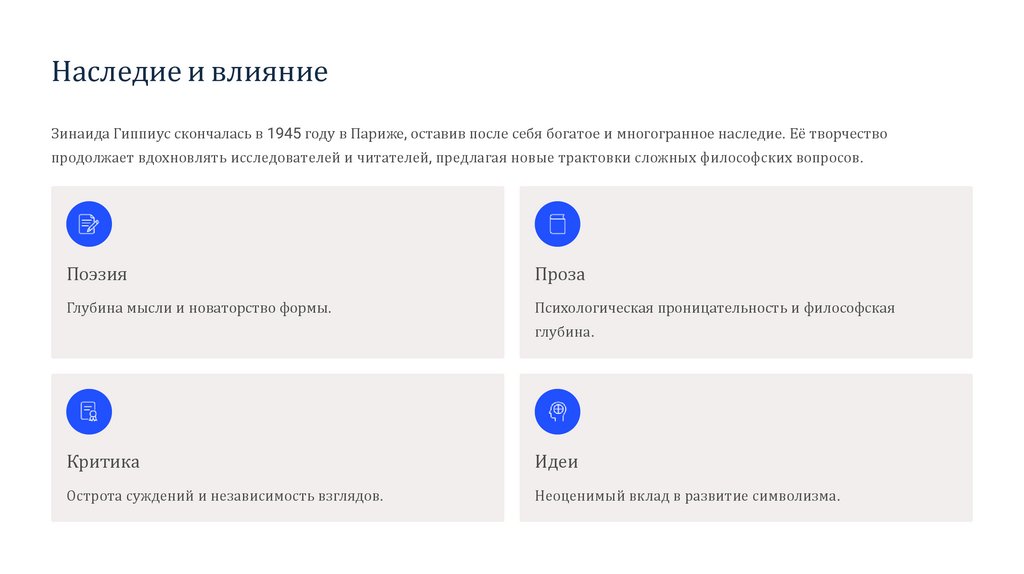 Наследие и влияниеЗинаида Гиппиус скончалась в 1945 году в Париже, оставив после себя богатое и многогранное наследие. Её творчество