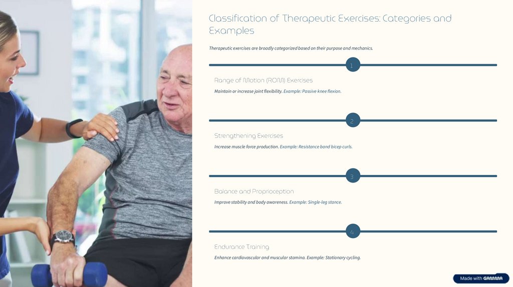 Therapeutic exercises are broadly categorized based on their purpose and mechanics.