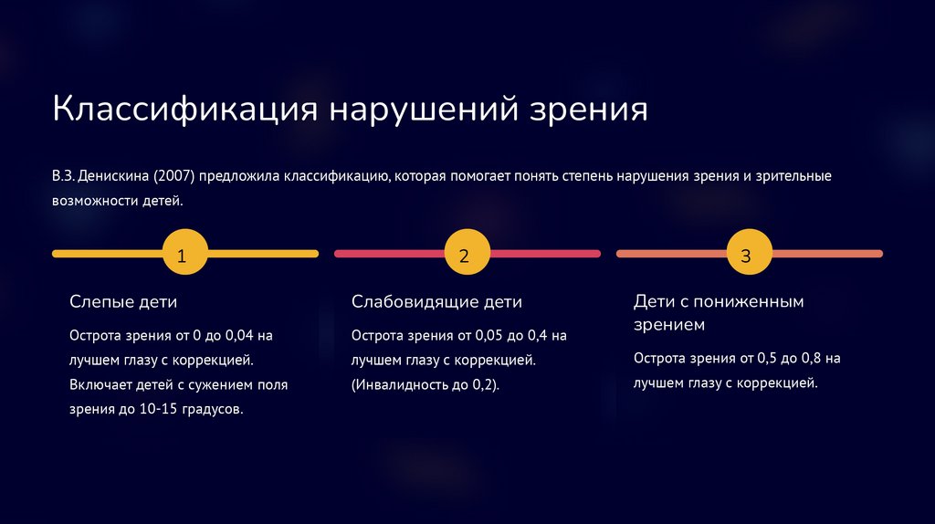 Классификация нарушений зренияВ.З. Денискина (2007) предложила классификацию, которая помогает понять степень нарушения зрения и зрительные