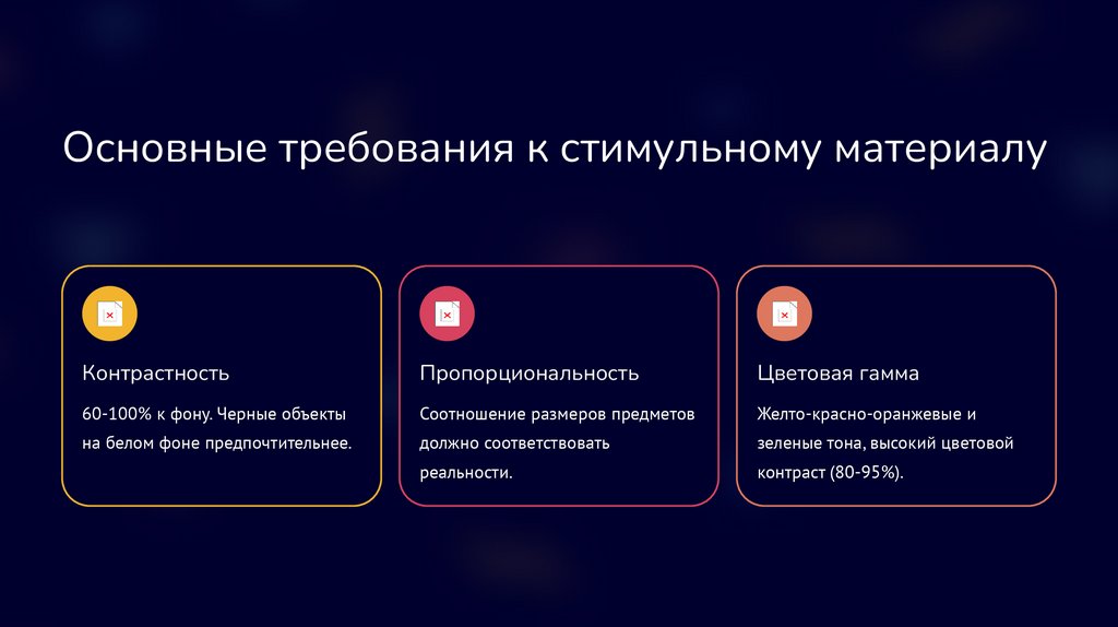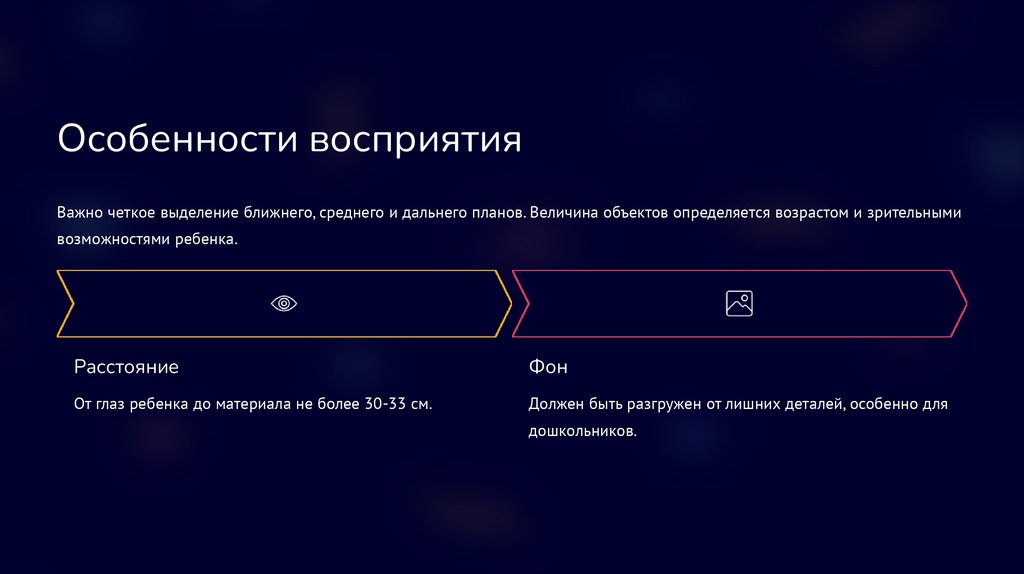 Особенности восприятияВажно четкое выделение ближнего, среднего и дальнего планов. Величина объектов определяется возрастом и зрительными