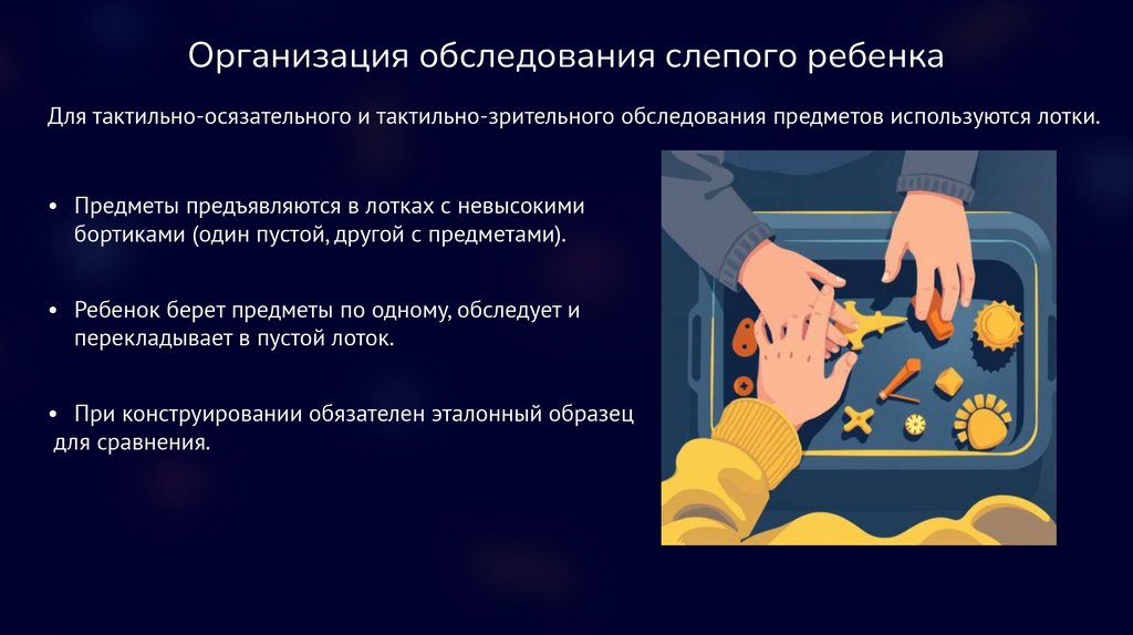 Организация обследования слепого ребенкаДля тактильно-осязательного и тактильно-зрительного обследования предметов используются лотки.