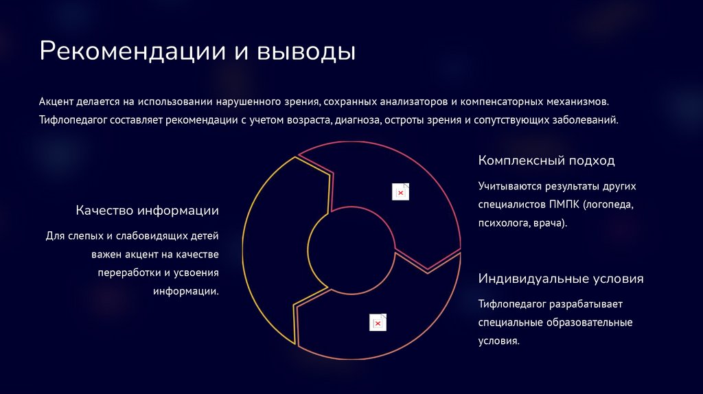Рекомендации и выводыАкцент делается на использовании нарушенного зрения, сохранных анализаторов и компенсаторных механизмов.