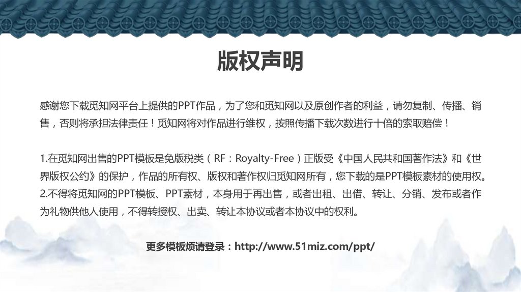 1.在觅知网出售的PPT模板是免版税类 RF Royalty-Free 正版受《中国人民共和国著作法》和《世