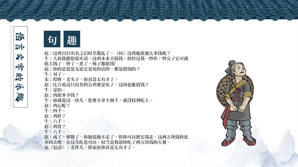 几桌上的陶伎俑 那陶伎俑掉到地下 竟粉碎了。季姬眼一瞧 鸡躲在