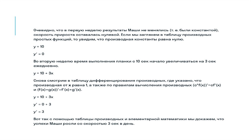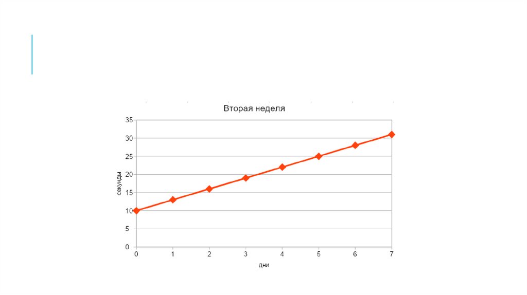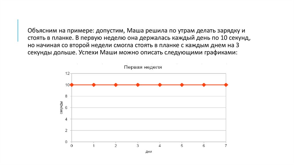 Объясним на примере: допустим, Маша решила по утрам делать зарядку истоять в планке. В первую неделю она держалась каждый день по 10 секунд,