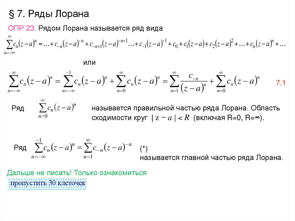 § 7. Ряды ЛоранаОПР 23. Рядом Лорана называется ряд вида