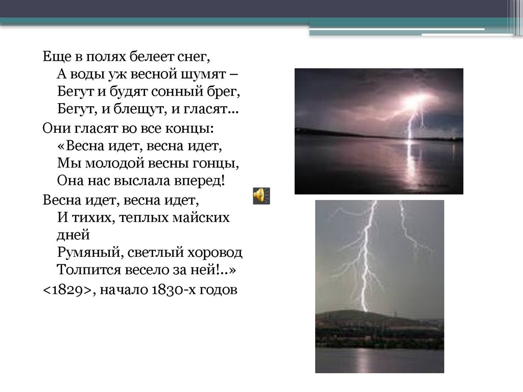 Еще в полях белеет снег,А воды уж весной шумят –