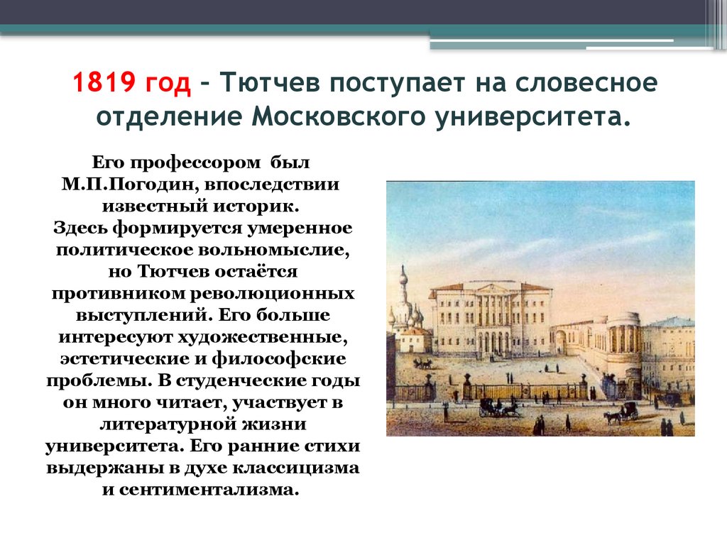 1819 год – Тютчев поступает на словесноеотделение Московского университета.