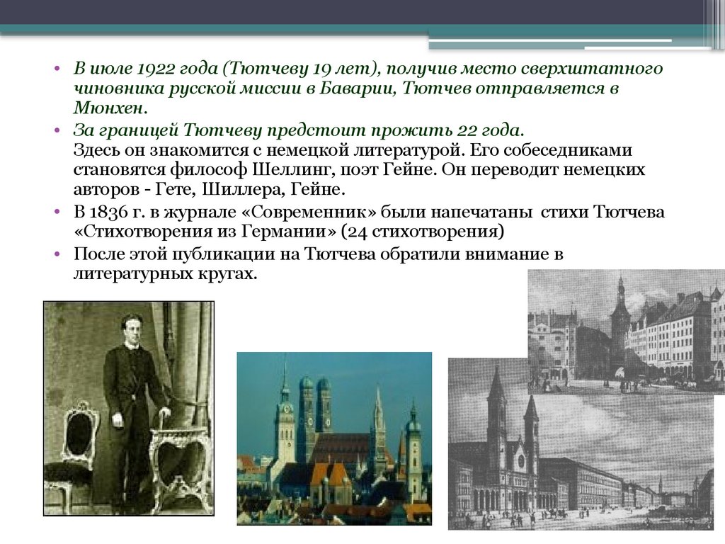 • В июле 1922 года (Тютчеву 19 лет), получив место сверхштатногочиновника русской миссии в Баварии, Тютчев отправляется в