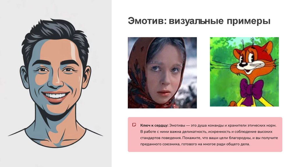 Эмотив: визуальные примерыКлюч к сердцу: Эмотивы — это душа команды и хранители этических норм.