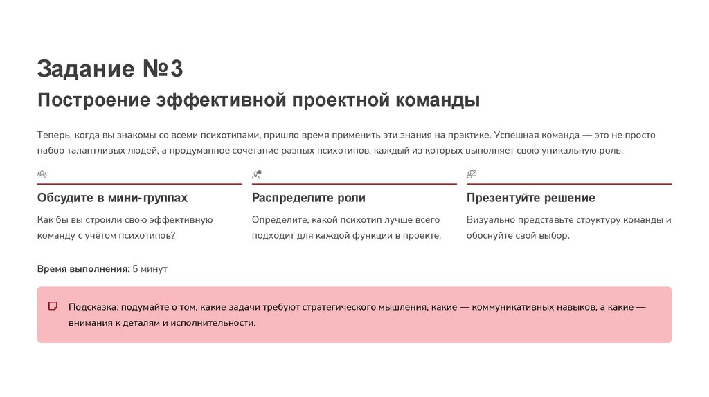 Подсказка: подумайте о том, какие задачи требуют стратегического мышления, какие — коммуникативных навыков, а какие —